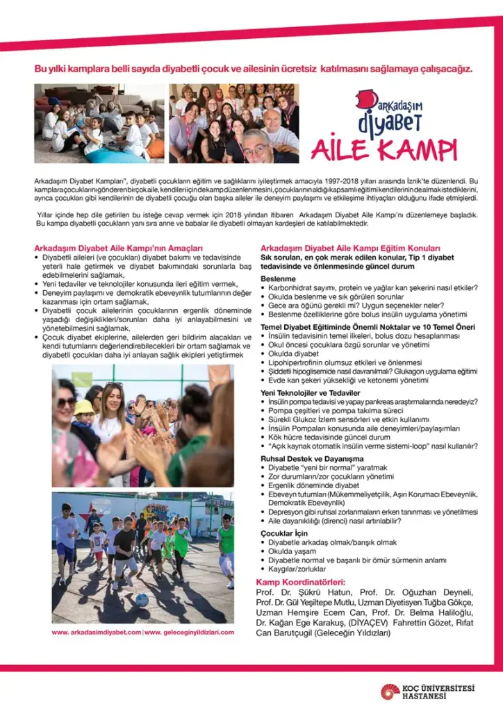 İki dönemde toplam 140 tip 1 diyabetli çocuk ve ailesinin katılması planlanmıştır. Arkadaşım Diyabet Aile Kampı Geleceğin Yıldızları Ekibi(https://www.geleceginyildizlari.com/) ile 2018 yılından beri yapılmaktadır ve eğitim, deneyim paylaşımı, diyabeti kabullenme ve gerekenleri yapma, yeni teknolojiler ile tanışma ve öğrenme, arkadaşlık, eğlence için eşsiz fırsatlar sunmaktadır. Kamp duyuru afişi ektedir, ayrıca kamp atmosferini anlatan video https://youtu.be/kIDQEhRVipE linkinden izlenebilmektedir.