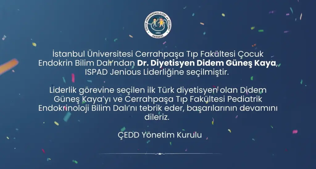 İstanbul Üniversitesi Cerrahpaşa Tıp Fakültesi Çocuk Endokrin Bilim Dalı’ndan Dr. Diyetisyen Didem Güneş Kaya, ISPAD Jenious Liderliğine seçilmiştir.