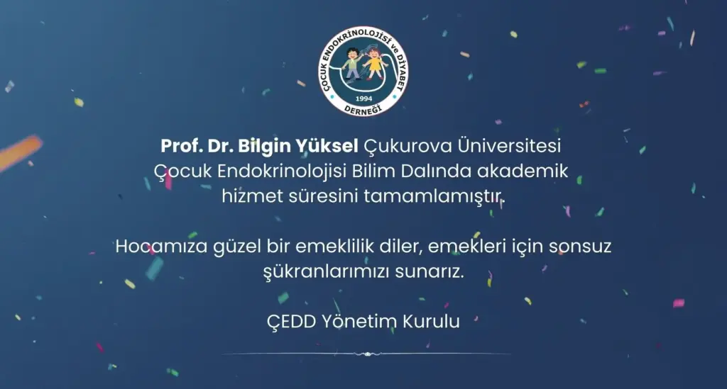 Prof. Dr. Bilgin Yüksel Çukurova Üniversitesi Çocuk Endokrinolojisi Bilim Dalında akademik hizmet süresini tamamlamıştır