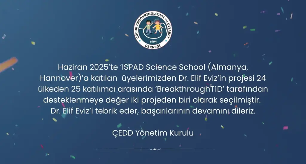Haziran 2025’te ‘ISPAD Science School (Almanya, Hannover)’a katılan üyelerimizden Dr. Elif Eviz’in projesi 24 ülkeden 25 katılımcı arasında ‘BreakthroughT1D’ tarafından...