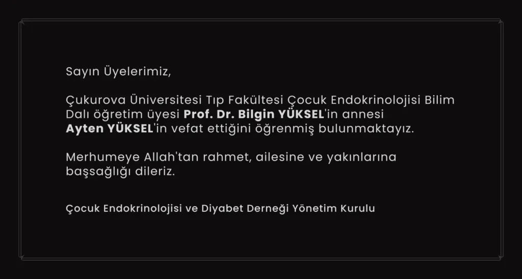 Sayın Üyelerimiz, Çukurova Üniversitesi Tıp Fakültesi Çocuk Endokrinolojisi Bilim Dalı öğretim üyesi Prof. Dr. Bilgin YÜKSEL'in annesi Ayten YÜKSEL'in vefat...