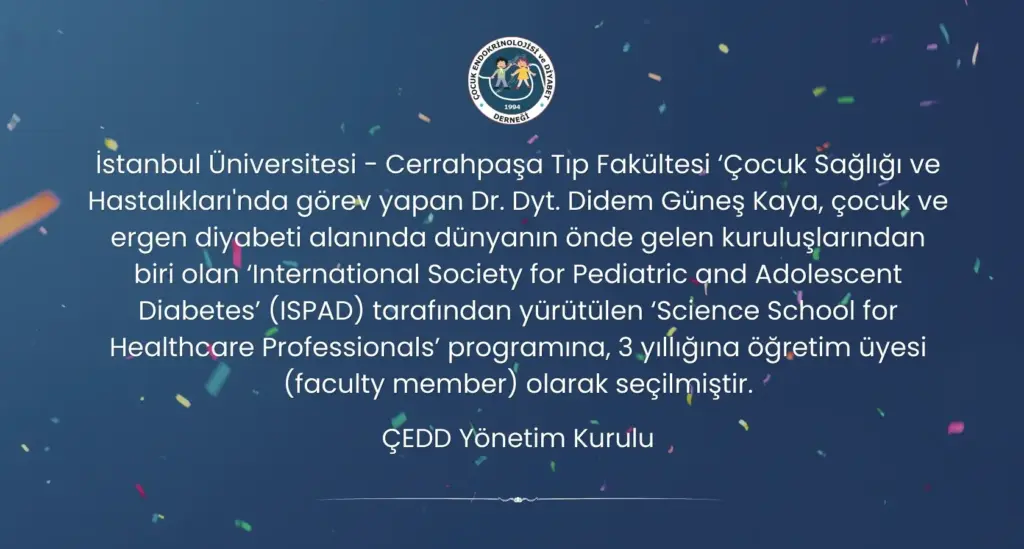 ISPAD tarafından yürütülen "Science School for Healthcare Professionals" programına, 3 yıllığına öğretim üyesi (faculty member) olarak seçilmiştir.